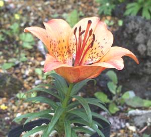 NEW!Lilium medeoloides Number 25 50 100 500 1,000Zones 4-8 Fall 2003 US$175 US$325 US$600 N/A N/ARare Japanese woodland lily with whorled foliage and nodding orange flowers. Called "wheel lily" in Japan because of the "wheels" of foliage. Best in cool summer climates. Needs a rich, humus-rich well-drained soil, moist throughout the growing season.
