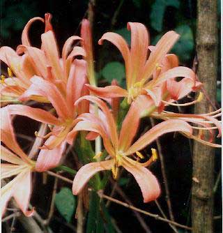 Lycoris sanguinea var. kiusiana Number 25 50 100 500 1,000Zones 6-9 Fall 2003 US$88 US$163 US$300 US$1,375 US$2,500Neglected but beautiful August-blooming bulb from Japan with clusters of showy orange flowers, with longer more spidery tepals than sanguinea. Leaves appear in spring, disappear before bloom. Moist well-drained soil in shade or-sun.