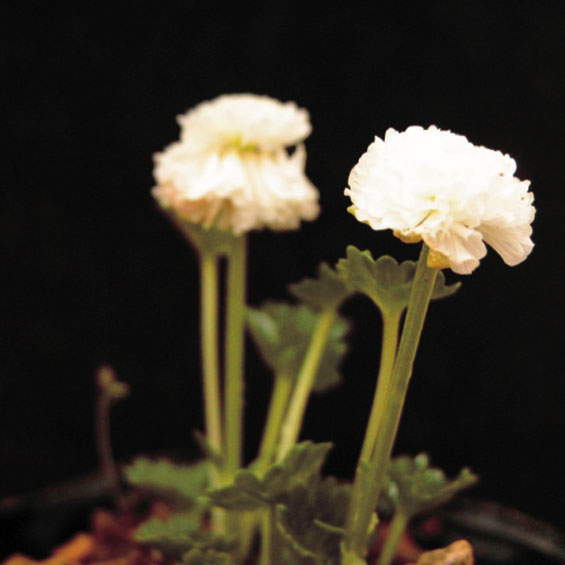 キンポウゲ草丈約5cmと非常に小型で花はレースを重ねたような可憐で繊細な八重咲。水はけの良い用土で肥培に努める。
