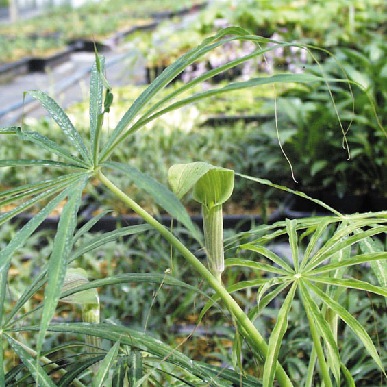 車状の葉に長く垂れた葉先と弁先が特徴。