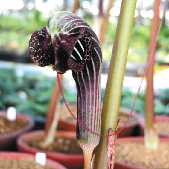 中国から導入した黒花種で赤く細いヒゲは70cmを超える。珍品。