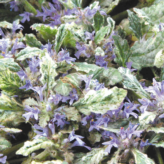 シソ全面白総散斑のキランソウ。冬~早春にかけては斑の白い部分が赤く染まり美しさがさらに映える逸品。毎年完売の人気品種。