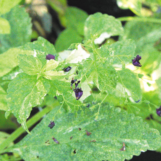 斑入クロバナノヒキオコシ 【030-022】 シソ 2019.10.26 白散~掃込み斑の安定した柄性。初夏に咲かせる黒い花も可憐。 開花期 5-7月 冬季 落葉 日当たり 明るい日陰 耐寒性 強 水やり 普通 施肥 春・秋に油粕肥料、生育時に有機液肥を2週間に1回程度 用土 山野草の土/基本培養土