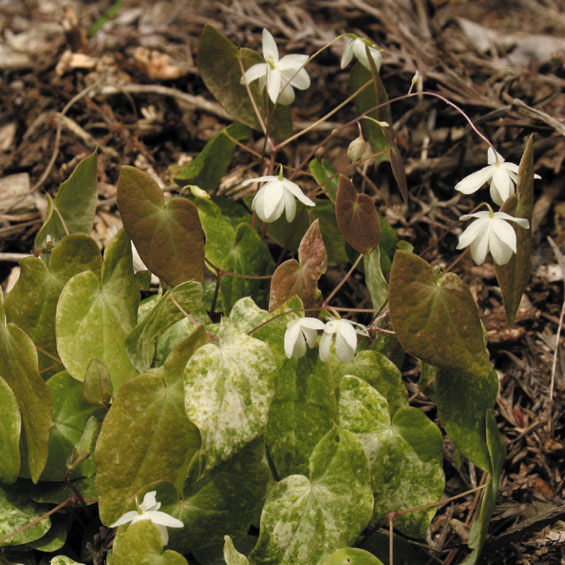 散斑梅花イカリソウ 【047-001】 イカリソウ 2019.11.04 繊細な感じの草姿に白い可憐な花を付ける梅花イカリソウの散斑品種。 開花期 4-5月 冬季 落葉 日当たり 明るい日陰 耐寒性 強 水やり 普通 施肥 春・秋に油粕肥料、生育時に有機液肥を2週間に1回程度 用土 山野草の土/基本培養土