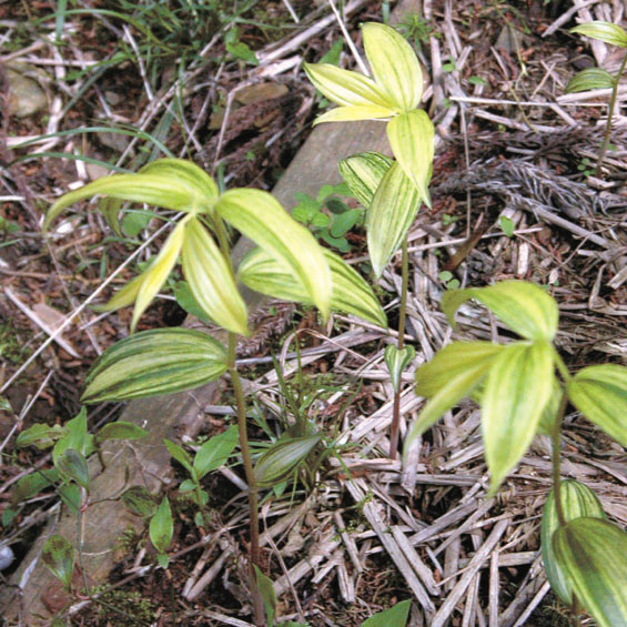 ホウチャクソウ「金河」 【055-005】 ホウチャクソウ 2019.11.04 黄曙散斑で後に白く冴える。葉幅広くやや大型になる品種。 開花期 4-6月 冬季 落葉 日当たり 明るい日陰 耐寒性 強 水やり 普通 施肥 春・秋に油粕肥料、生育時に有機液肥を2週間に1回程度 用土 山野草の土/基本培養土