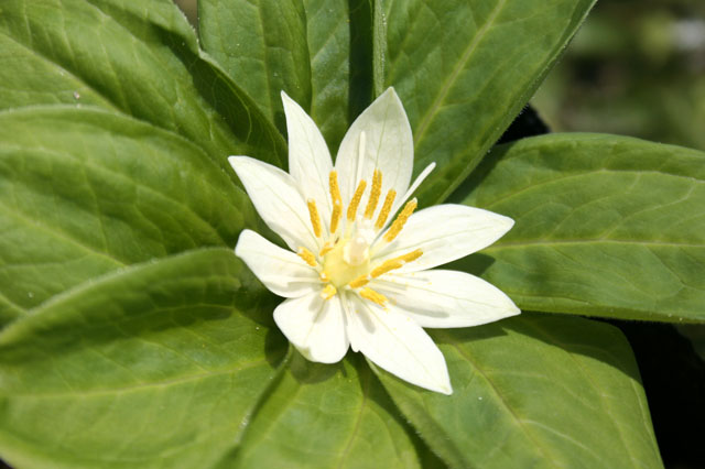 車状の葉の上に白い花を咲かせるツクバネソウの仲間。