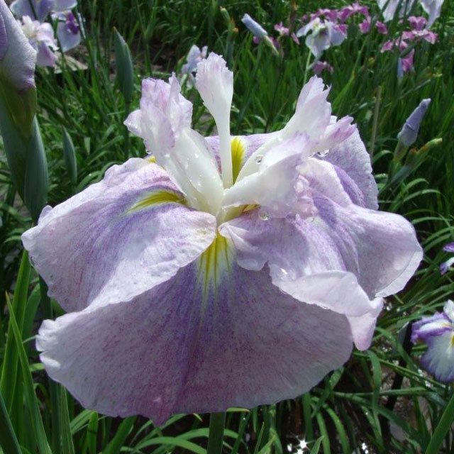 江戸系の平咲き六英花。藤色の筋と砂子が入る桜色が美しい品種。