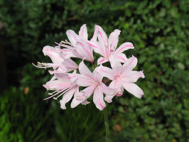 ネリネ「ザンティア」 【304-033】 ネリネ 2019.11.04 白い花弁に桃筋が映える。 開花期 10-11月 冬季 冬緑 日当たり 日向 耐寒性 中 水やり 少なめ 施肥 春・秋に油粕肥料、生育時に有機液肥を2週間に1回程度 用土 山野草の土/基本培養土