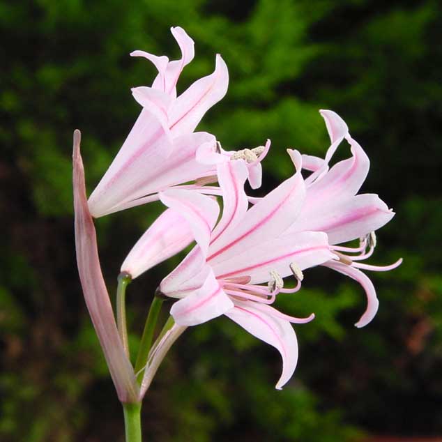ネリネ・プディカ 【304-055】 ネリネ 2019.11.04 淡いピンクに濃ピンクのスジが入るトランペット咲きの原種。 開花期 8-10月 冬季 冬緑 日当たり 日向 耐寒性 中 水やり 少なめ 施肥 春・秋に油粕肥料、生育時に有機液肥を2週間に1回程度 用土 山野草の土/基本培養土