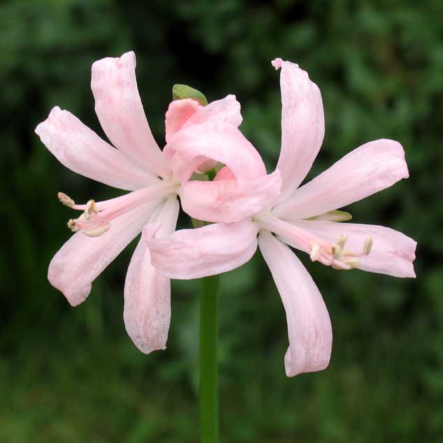 ネリネ「レディ・レデスデール」 【304-058】 ネリネ 2019.11.04 ほんのり桜色で軟らかい印象の花色が特徴。 開花期 10-11月 冬季 冬緑 日当たり 日向 耐寒性 中 水やり 少なめ 施肥 春・秋に油粕肥料、生育時に有機液肥を2週間に1回程度 用土 山野草の土/基本培養土