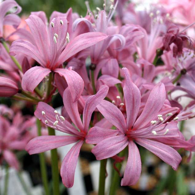 ネリネ「フジムスメ」 【304-062】 ネリネ 2019.11.04 桃藤色で青みを交えた珍しい花色。 開花期 10-11月 冬季 冬緑 日当たり 日向 耐寒性 中 水やり 少なめ 施肥 春・秋に油粕肥料、生育時に有機液肥を2週間に1回程度 用土 山野草の土/基本培養土