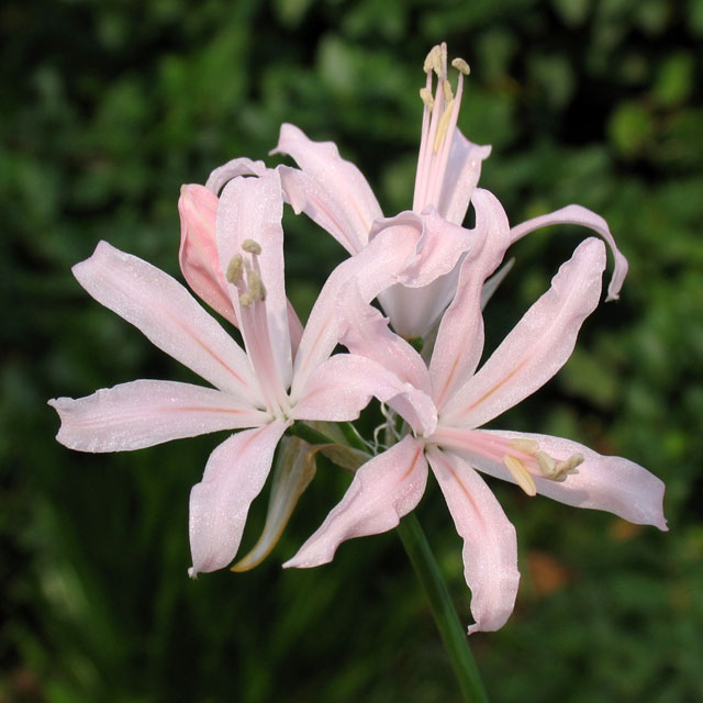 ネリネ「シーラ」 【304-096】 ネリネ 2019.11.04 淡いピンク色の花弁にほんのりと赤いスジが入る。 開花期 10-11月 冬季 冬緑 日当たり 日向 耐寒性 中 水やり 少なめ 施肥 春・秋に油粕肥料、生育時に有機液肥を2週間に1回程度 用土 山野草の土/基本培養土