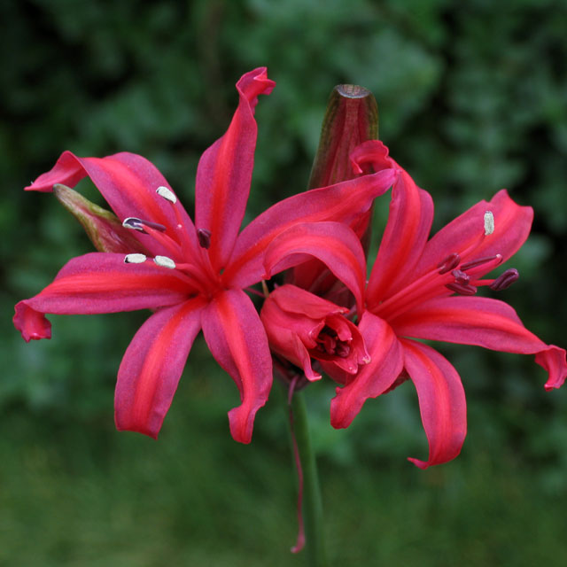 ネリネ「エンペラー」 【304-098】 ネリネ 2019.11.04 濃赤紫の花弁に赤いスジが入る稀少品種。 開花期 10-11月 冬季 冬緑 日当たり 日向 耐寒性 中 水やり 少なめ 施肥 春・秋に油粕肥料、生育時に有機液肥を2週間に1回程度 用土 山野草の土/基本培養土