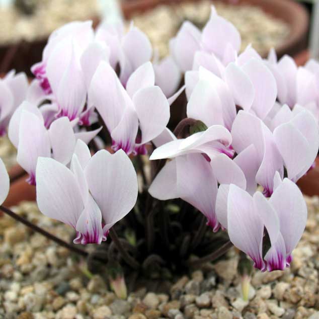 シクラメン・グラエカム 【306-009】 サクラソウ 2019.10.26 地中海西部原産で淡いピンクの花に模様の美しい葉。 開花期 8-10月 冬季 冬緑 日当たり 日向 耐寒性 強 水やり 少なめ 施肥 春・秋に油粕肥料、生育時に有機液肥を2週間に1回程度 用土 山野草の土/基本培養土