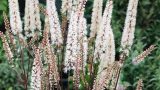 Clematis ‘Miss Bateman’ 早咲き大輪系。英国王立園芸協会によるアワード・オブ・ガーデン・メリット受賞品種。重なりの良い白花で中心部に緑の筋が入る。シベは赤茶色。高さ2-2.5m、花期は5-6月と8-9月。剪定は弱剪定(グルーブ2)。1869年にイギリスのチャールズ・ノーブルによって’Fortunei’ と’Standishii’の交配によって作出された。品種名は、著名なラン生産者James Batemanの娘、Miss Chatherine Batemanにちなむ。