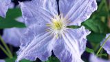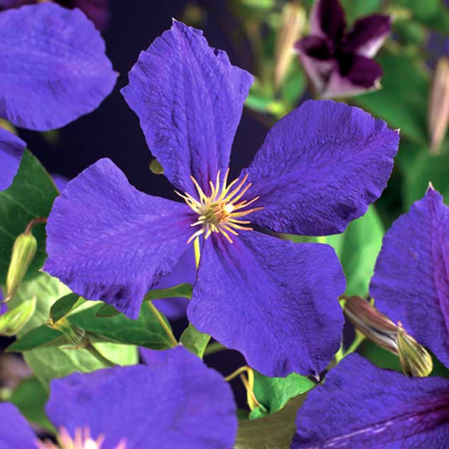 Clematis ‘Jackmanii’ 遅咲き大輪系。花径10-15cm。濃青紫色の青花代表的品種で、英国王立園芸協会のアワード・オブ・ガーデン・メリット受賞品種。高さ3-4m、花期は7-9月。剪定は強剪定(グループ3)。イギリスGeorge Jackman Jr.によりC.lanuginosaとC.viticella ‘Atrorubens’の交配から作出、1863年に発表。