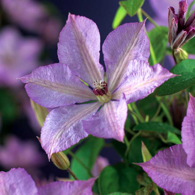 Clematis ‘Margaret Hunt’ 遅咲き大輪系。藤紫色の淡い色合いが特徴の大輪花。花径9-15cm、高さ2.5-3m、花期は7-9月。剪定は強剪定(グループ3)。イギリスのMargaret Huntが1960年ころ作出、1969年発表。