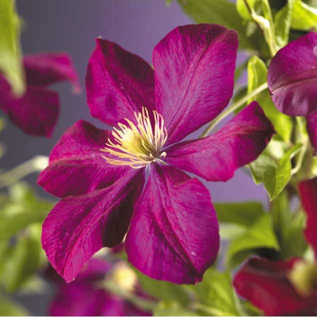 キンポウゲClematis ‘Voluceau’ 遅咲き大輪系。深い濃赤紫色の大輪花。高さ2.5-3m、花期7-9月。剪定は強剪定(グループ3)。1970年ごろフランスのA.Giraultが’Ville de Lyon’と’Pourpre Mat’をもとに作出。