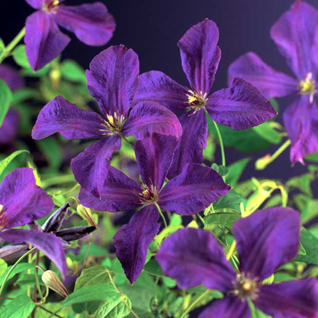 Clematis ‘Polish Spirit’ 遅咲き大輪系。深い青紫色に赤紫色の筋が入る。栽培が容易で初心者向けの品種。1990年、ポーランドのStefan Franczakの作出。花径5-10cm、高さ3-4m、花期7-9月、剪定は強剪定(グループ3)。かつてはヴィチセラタイプとして扱われていたが、現在ではジャックマニータイプと再分類されている。
