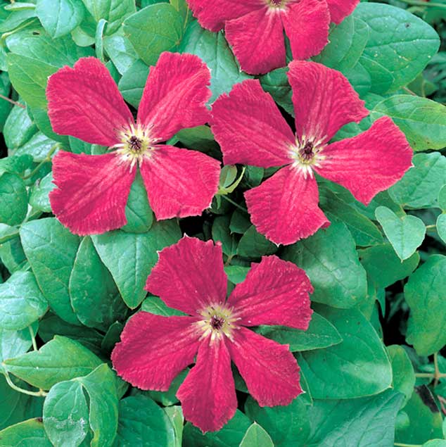 Clematis ‘Rubra’ ヴィチセラ系。花径5-6cm、高さ2.5-4.5m、花期7-9月、剪定は強剪定(グループ3)。アンティーク品種で1597年には記述が既にある。育成者は不明。