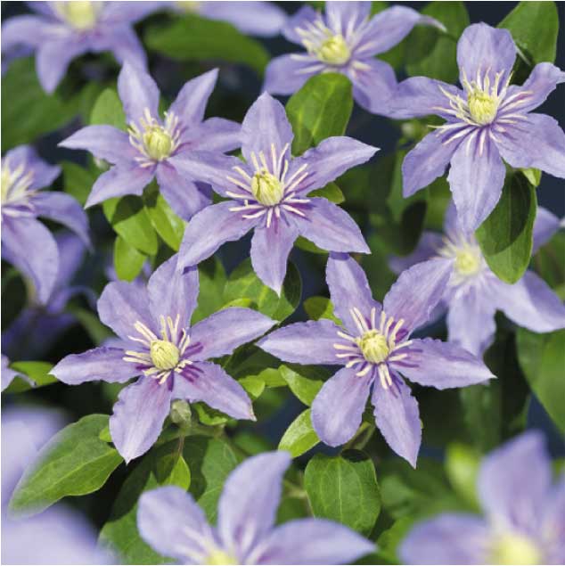 Clematis ‘Justa’ ヴィチセラ系。藤紫色に桃紫の筋が入りシベは黄緑色。高さ1-1.5m、剪定は強剪定(グループ3)。1988年、リトアニアのL. Bakeviciusによる作出。