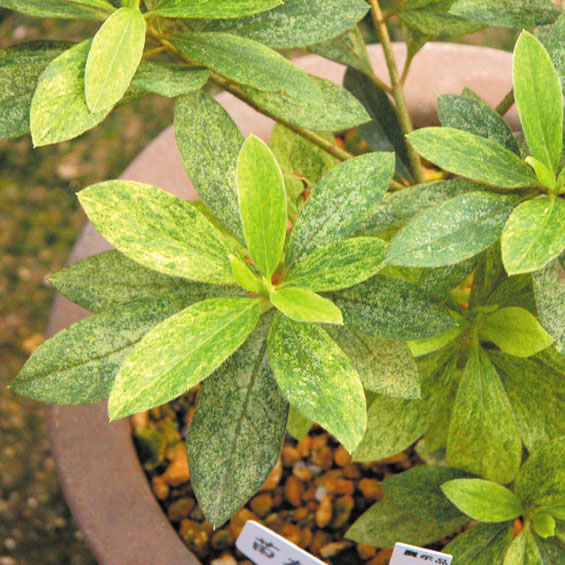 黄散斑~砂子斑の全面斑が美しい。花が無い時期でも楽しめる。生育は旺盛で栽培も容易。