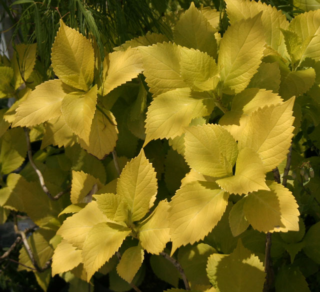 黄金葉アジサイ 【439-009】 ユキノシタ 2019.10.26 ピンクテマリ咲き黄金葉。 開花期 5-6月 冬季 落葉 日当たり 明るい日陰 耐寒性 中 水やり 多め 施肥 春・秋に油粕肥料、生育時に有機液肥を2週間に1回程度 用土 基本培養土/山野草の土