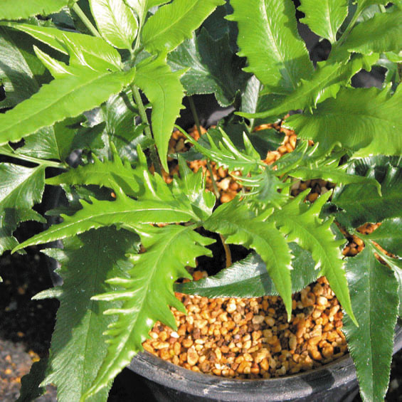 羽衣イワガネゼンマイ「鎧武者」 【603-023】 ホウライシダ 2019.10.26 九州産羽衣芸の銘品。羽衣芸が進むと角の様に羽衣が立ち上がる。面白い葉型の逸品。 開花期 冬季 常緑 日当たり 日陰 耐寒性 強 水やり 普通 施肥 生育期に有機液肥を2週間に1回程度 用土 基本培養土/ミズゴケ