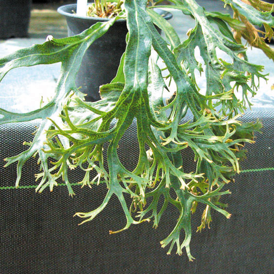 獅子イワダレヒトツバ「吉川獅子」 【603-029】 ウラボシ 2019.10.26 細かな獅子芸が派手で豪華なイワダレヒトツバ。株に勢いが付くと獅子芸の葉が重みで垂れ下がるので懸崖鉢に植えて楽しむ。 開花期 冬季 常緑 日当たり 日陰 耐寒性 強 水やり 普通 施肥 生育期に有機液肥を2週間に1回程度 用土 基本培養土/ミズゴケ