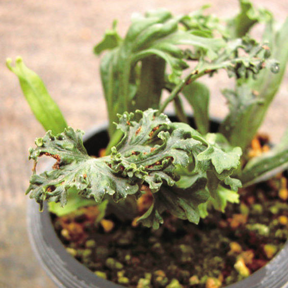 ノキシノブ「御所獅子」 【604-012】 ウラボシ 2019.10.26 小型の獅子葉品種で扇状に広がるため小鉢作りでよくまとまる。 開花期 冬季 常緑 日当たり 日陰 耐寒性 強 水やり 普通 施肥 生育期に有機液肥を2週間に1回程度 用土 基本培養土/ミズゴケ