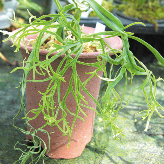 ノキシノブ「土佐五芸」 【604-018】 ウラボシ 2019.10.26 細長い枝打ち葉が多数広がる高知産の高級品種で上芸品はとてもノキシノブには見えない。珍品。 開花期 冬季 常緑 日当たり 日陰 耐寒性 強 水やり 普通 施肥 生育期に有機液肥を2週間に1回程度 用土 基本培養土/ミズゴケ