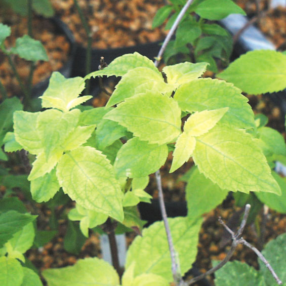 ヤマアジサイ「黄冠」 【691-004】 ヤマアジサイ 2019.11.04 出芽の極黄曙斑が美しい葉芸品種。 開花期 5-7月 冬季 落葉 日当たり 明るい日陰 耐寒性 強 水やり 多め 施肥 春・秋に油粕肥料、生育時に有機液肥を2週間に1回程度 用土 山野草の土/基本培養土