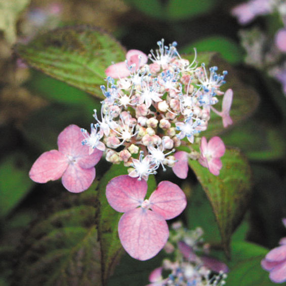 ヤマアジサイ徳島県で近年発見された濃赤紫の梅弁花で、赤、ピンク、紫、青の混じったような微妙な色合いが魅力。珍品。