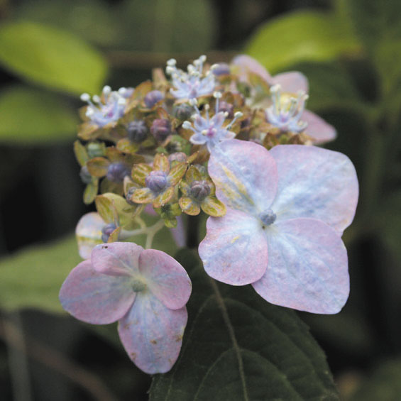ヤマアジサイ「横浪の月」 【691-024】 ヤマアジサイ 2019.11.04 高知県産の丸弁品種。 開花期 5-7月 冬季 落葉 日当たり 明るい日陰 耐寒性 強 水やり 多め 施肥 春・秋に油粕肥料、生育時に有機液肥を2週間に1回程度 用土 山野草の土/基本培養土