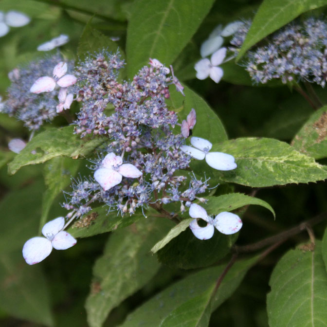 ヤマアジサイ「小町錦」 【691-041】 ヤマアジサイ 2019.11.04 白散斑に薄青花 開花期 5-7月 冬季 落葉 日当たり 明るい日陰 耐寒性 強 水やり 多め 施肥 春・秋に油粕肥料、生育時に有機液肥を2週間に1回程度 用土 山野草の土/基本培養土