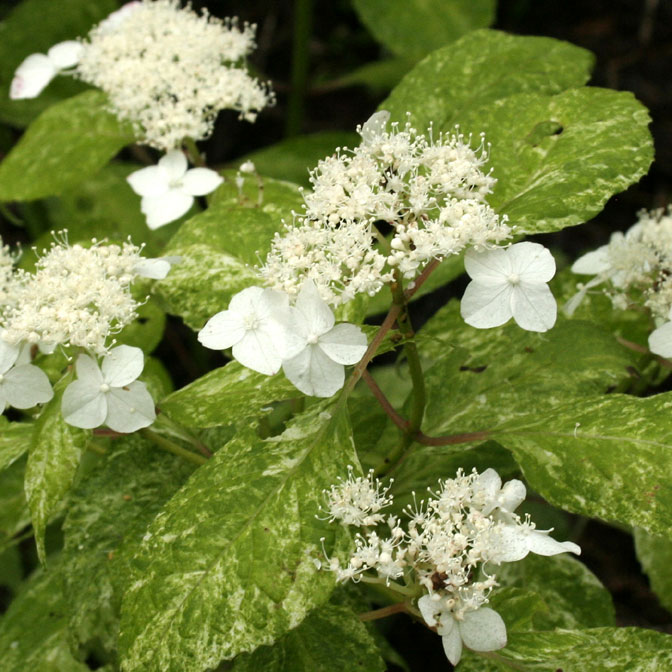 ヤマアジサイ「白花白散縞」 【691-048】 ヤマアジサイ 2019.11.04 高知県産の斑入り白花種。 開花期 5-7月 冬季 落葉 日当たり 明るい日陰 耐寒性 強 水やり 多め 施肥 春・秋に油粕肥料、生育時に有機液肥を2週間に1回程度 用土 山野草の土/基本培養土