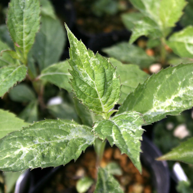 ヤマアジサイ「釜無山」 【691-050】 ヤマアジサイ 2019.11.04 白散斑ノコギリ葉品種。 開花期 5-7月 冬季 落葉 日当たり 明るい日陰 耐寒性 強 水やり 多め 施肥 春・秋に油粕肥料、生育時に有機液肥を2週間に1回程度 用土 山野草の土/基本培養土