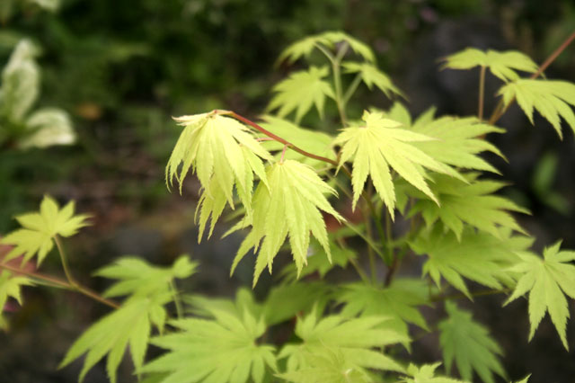 モミジ「パルマティフォリウム」 【692-004】 カエデ 2019.10.26 鮮やかな黄緑色が特徴。 開花期 4-6月 冬季 落葉 日当たり 日向 耐寒性 強 水やり 普通 施肥 春・秋に油粕肥料、生育時に有機液肥を2週間に1回程度 用土 基本培養土/山野草の土