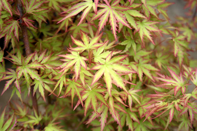 モミジ「ヒガサヤマブローム」 【692-016】 カエデ 2019.10.26 濃赤紫の覆輪模様が鮮やか。 開花期 4-6月 冬季 落葉 日当たり 日向 耐寒性 強 水やり 普通 施肥 春・秋に油粕肥料、生育時に有機液肥を2週間に1回程度 用土 基本培養土/山野草の土
