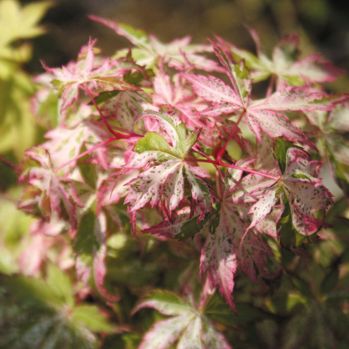モミジ「羽前錦」 【692-049】 カエデ 2019.10.26 散掃け斑で紅斑が次第に白斑に抜ける。秋葉は赤茶。 開花期 4-6月 冬季 落葉 日当たり 日向 耐寒性 強 水やり 普通 施肥 春・秋に油粕肥料、生育時に有機液肥を2週間に1回程度 用土 基本培養土/山野草の土