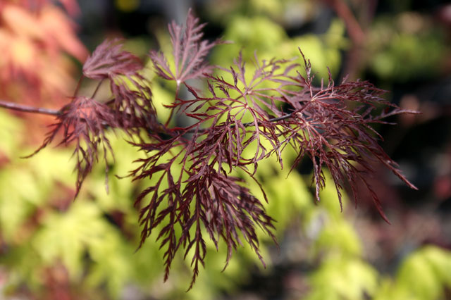 モミジ「レッド・フリグリー・レース」 【692-090】 カエデ 2019.10.26 黒に近い濃赤紫色の葉が細かく切れ込んでレース状。 開花期 4-6月 冬季 落葉 日当たり 日向 耐寒性 強 水やり 普通 施肥 春・秋に油粕肥料、生育時に有機液肥を2週間に1回程度 用土 基本培養土/山野草の土