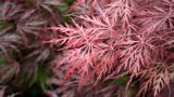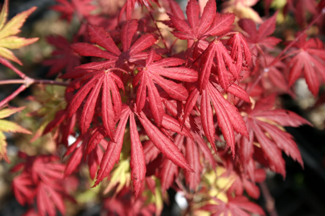 モミジ「ブルイン」 【692-110】 カエデ 2019.10.26 鮮やかな赤い葉に墨流し状に濃色となる。 開花期 4-6月 冬季 落葉 日当たり 日向 耐寒性 強 水やり 普通 施肥 春・秋に油粕肥料、生育時に有機液肥を2週間に1回程度 用土 基本培養土/山野草の土