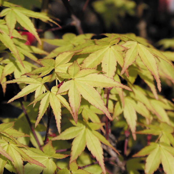 モミジ「若緑」 【692-135】 カエデ 2019.10.26 赤い軸に黄色いは、爪紅のコントラストが美しい。 開花期 4-6月 冬季 落葉 日当たり 日向 耐寒性 強 水やり 普通 施肥 春・秋に油粕肥料、生育時に有機液肥を2週間に1回程度 用土 基本培養土/山野草の土
