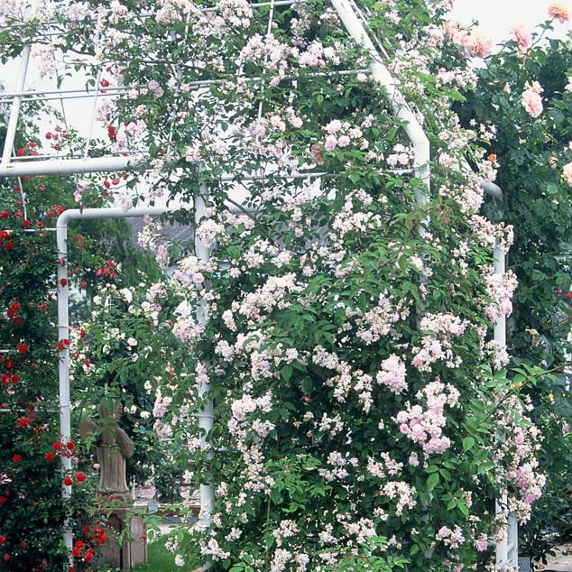 ポールズ・ヒマラヤン・ムスク 【693-050】 バラ 2019.10.26 淡ピンクに小輪、超多花性。長大に伸びる。春咲き。ランブラー系。 開花期 4-6月 冬季 落葉 日当たり 日向 耐寒性 強 水やり 普通 施肥 春・秋に油粕肥料、生育期にバイオポスト・リキッドサム(液肥)を2週間に1回程度 用土 基本培養土