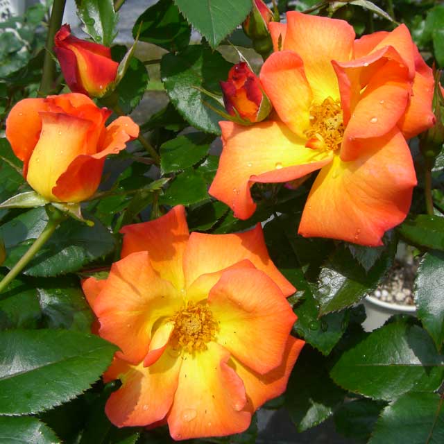 プレイ・ボーイ 【695-060】 バラ 2019.10.26 朱橙色で中心が黄色の半八重平咲き。超多花性。 開花期 4-10月 冬季 落葉 日当たり 日向 耐寒性 強 水やり 普通 施肥 春・秋に油粕肥料、生育期にバイオポスト・リキッドサム(液肥)を2週間に1回程度 用土 基本培養土