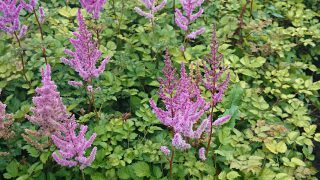 ASTILBE c. 'Pumila' 草丈25cm、矮性でグランドカバー状となり、夏の終わりにライラック色の可憐な花を付ける。鉢植えにも向く。開花期 7-9月 冬季 日当たり 明るい日陰 耐寒性 強 水やり 多め 施肥 用土