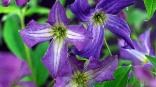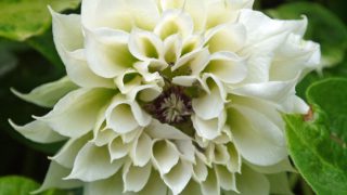 Clematis viticella 藤紫色のうつむき咲き。シベは淡い緑色。高さ4-5m、花期は7-9月。剪定は強剪定(グループ3)。南ヨーロッパ原産の原種で1569年にはすでにヒュー・モーガンによって栽培されていたが、当時はClemati...