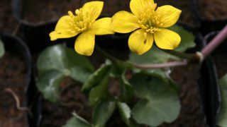 伸びたランナーの先に黄色い花を咲かせる水辺の植物。開花期 4-6月 冬季 落葉 日当たり 日向 耐寒性 強 水やり 多め 施肥 春・秋に油粕肥料、生育時に有機液肥を2週間に1回程度 用土 山野草の土/基本培養土