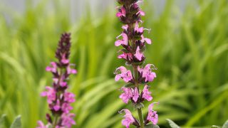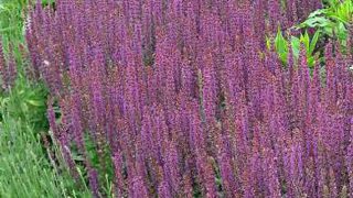Salvia nemorosa 'Ostfriesland' 草丈45cm、深い紫色の花。開花期 6-7月 冬季 落葉 日当たり 日向 耐寒性 強 水やり 普通 施肥 春・秋に油粕肥料、生育時に有機液肥を2週間に1回程度 用土 オリジナル園...
