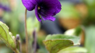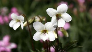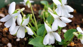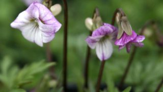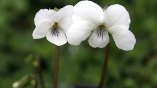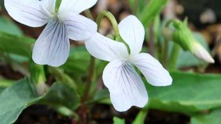 極丸弁の白花で紫色の筋が入る。開花期 3-5月 冬季 落葉 日当たり 日向 耐寒性 強 水やり 普通 施肥 春・秋に油粕肥料、生育時に有機液肥を2週間に1回程度 用土 山野草の土/基本培養土